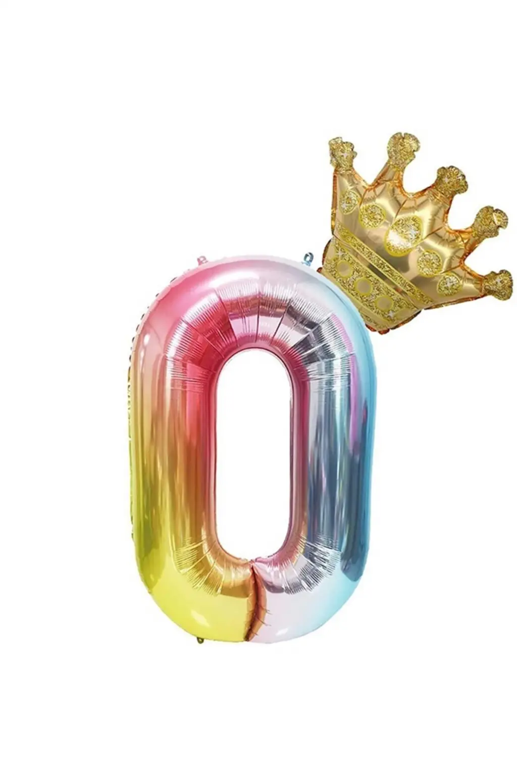 0 Rakam Gökkuşağı Rakam Ve Kral Tacı Folyo Balon Doğum Günü Parti Kutlama Seti