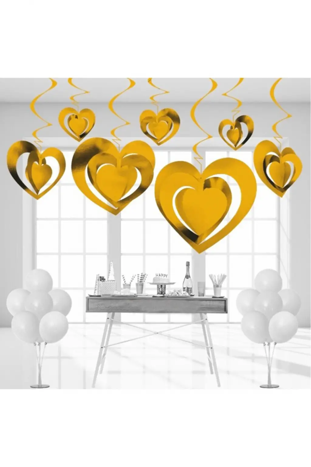 3D Görünümlü Tavan Sarkıt Gold Renk Kalp Süs 12'li Sevgili Süprizi Süslemesi