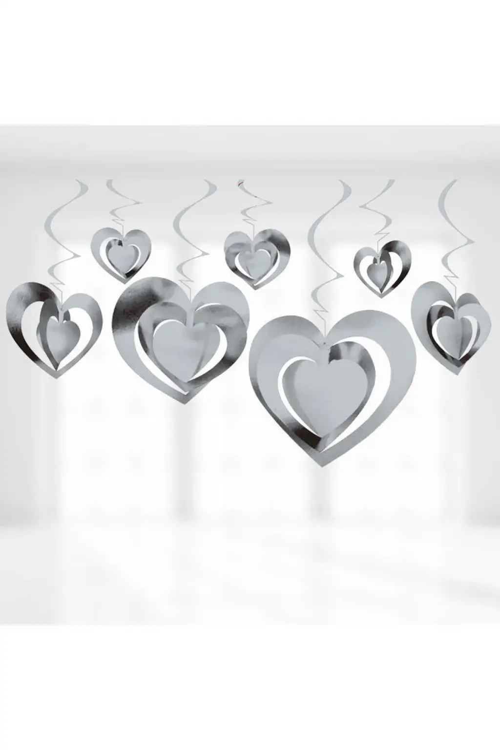 3D Görünümlü Tavandan Sarkıt Gümüş Renk Kalp Süs 12'li Sevgili Sürpriz Süslemesi