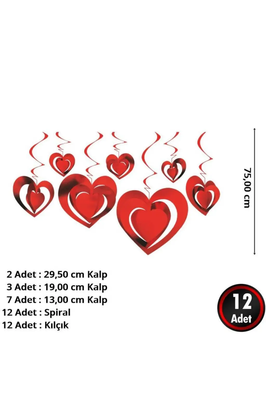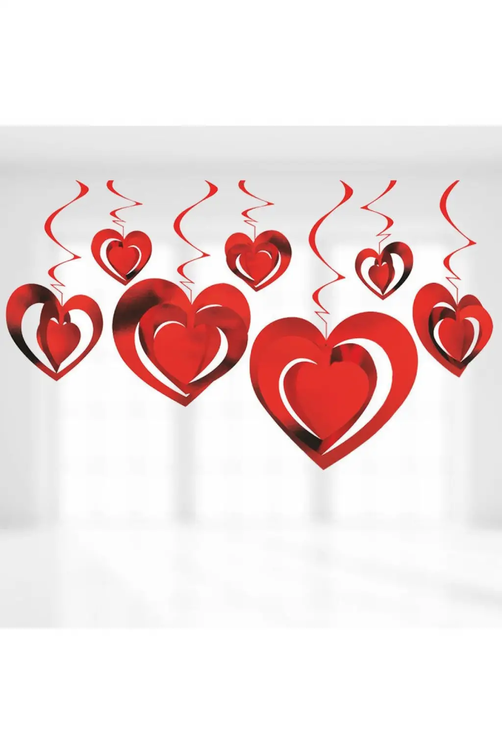 3D Görünümlü Tavandan Sarkıt Kırmızı Renk Kalp Süs 12'li Sevgili Sürpriz Süslemesi