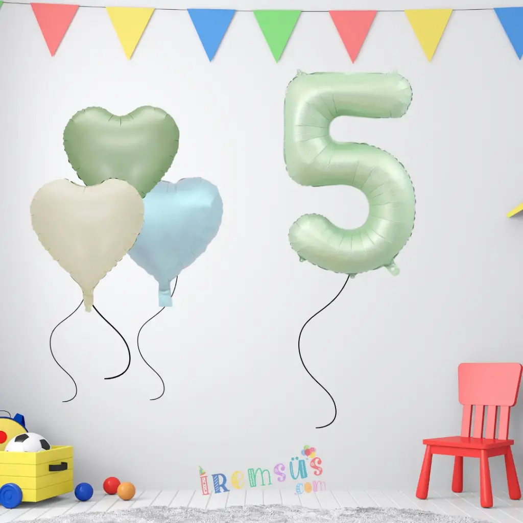 5 Yaş Doğum Günü Su Yeşili Konsept Kalp Balonlu Süsleme Seti
