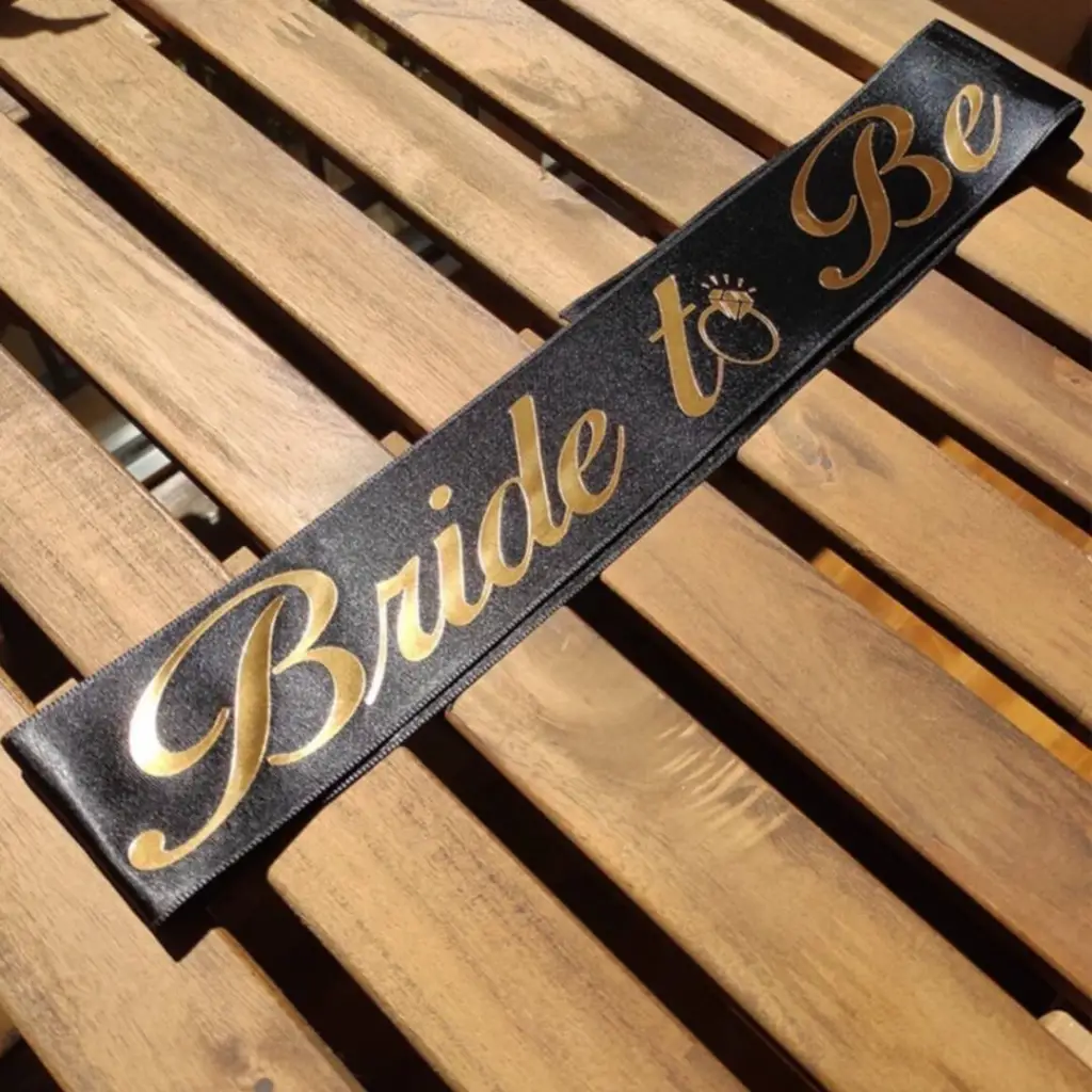 Saten kumaş üstüne Bride To Be yazılıdır. Yazı baskısı üst kalite olup parıldayan bir yapısı vardır, yaldızlı bir yapıya sahiptir.