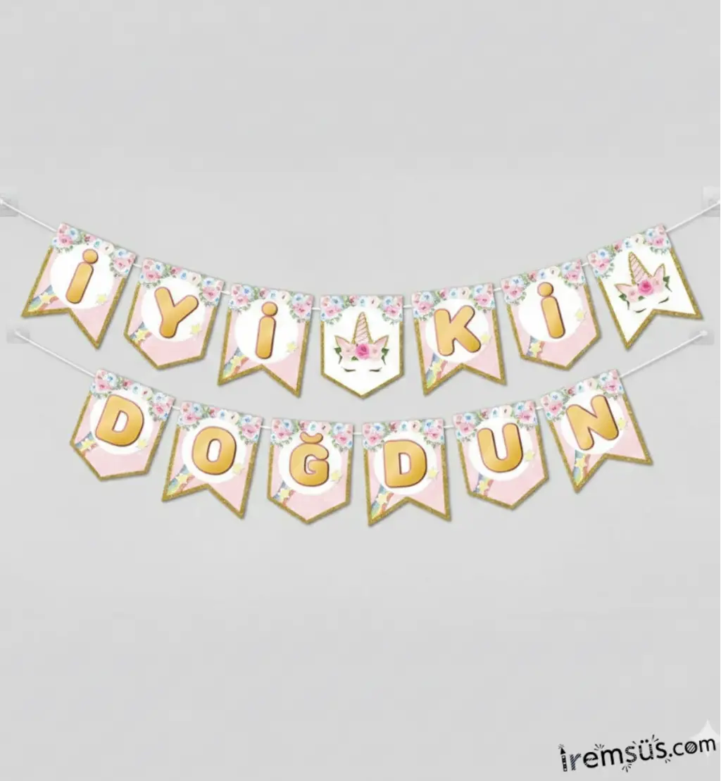 Çiçekli Unicorn Konsept İyiki Doğdun Yazısı Banner Çiçekli Unicorn Süslemesi 190 cm