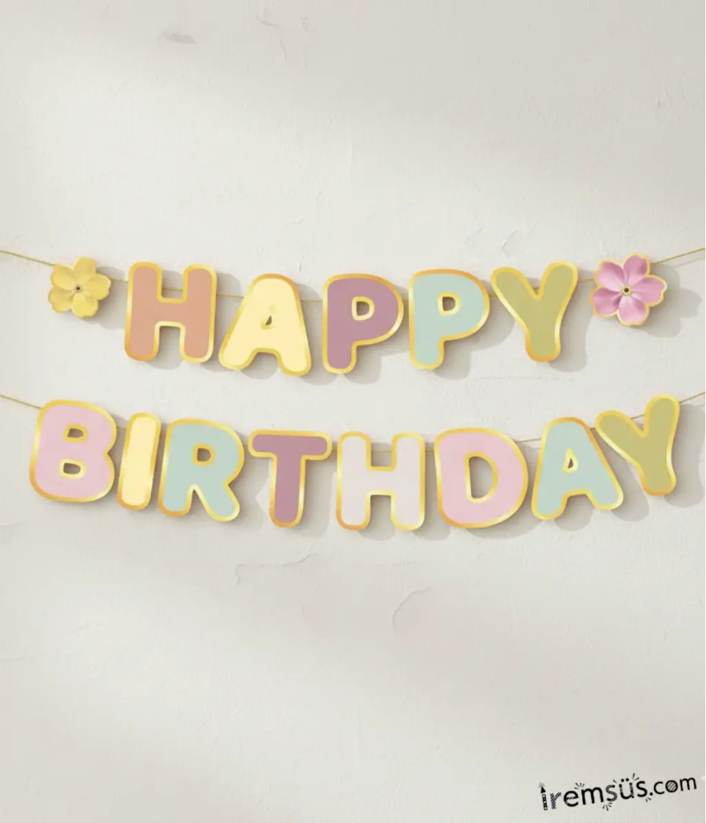 Makaron Renk Tema Çiçekli Doğum Günü Partisi Happy Birthday Banner Yazı 210 cm Çiçekli Yazı