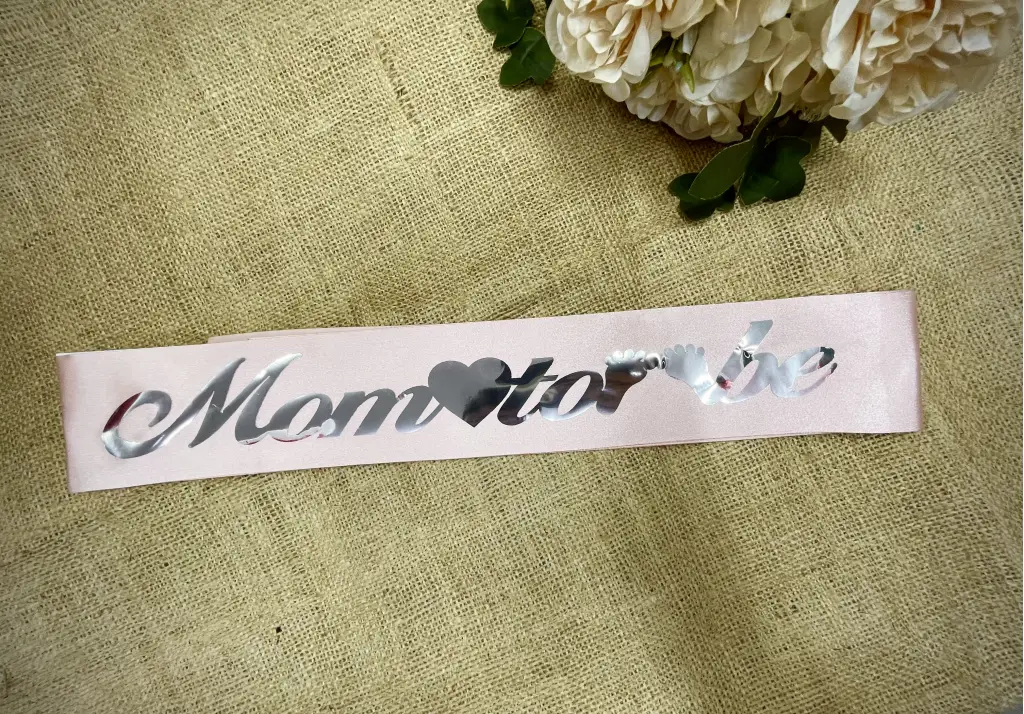 Saten kumaş üstüne Mom To Be yazılıdır. Yazı baskısı üst kalite olup parıldayan bir yapısı vardır, yaldızlı bir yapıya sahiptir