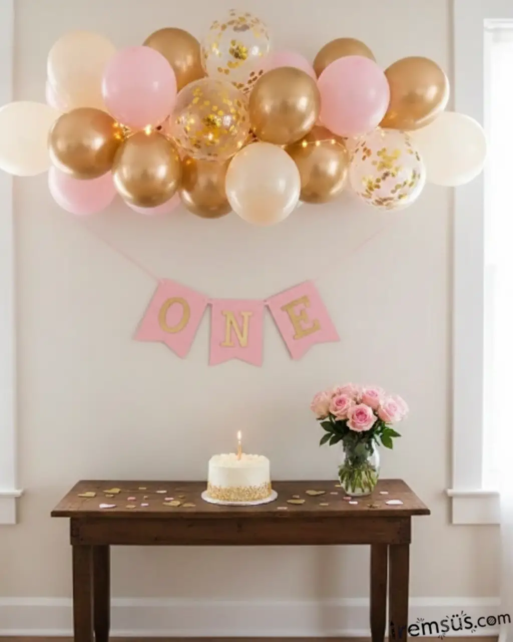 One Yazılı Pembe Renk Gold Yaldızlı Banner Süsleme 1 Yaş Doğum Günü Süslemesi