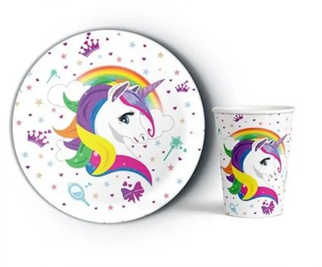 Unicorn Konsept Doğum Günü Partisi Karton Tabak Bardak Seti 8 li Unicorn Süsleme